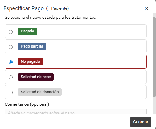 Esto nos permite indicar si se encuentra pagado, pagado parcialmente, no pagado, o si el paciente solicito cesarlo o donarlo en caso de no querer continuar manteniendo el material.