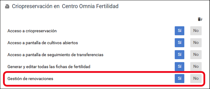 Para poder acceder a esta pantalla el usuario debe tener otorgado el permiso "Gestión de renovaciones" dentro de la sección criopreservación.