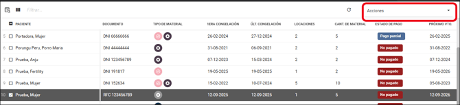5. Para gestionar el material de un paciente, seleccionar la fila correspondiente al mismo y luego utilizar el menú "Acciones" para iniciar la operación deseada.