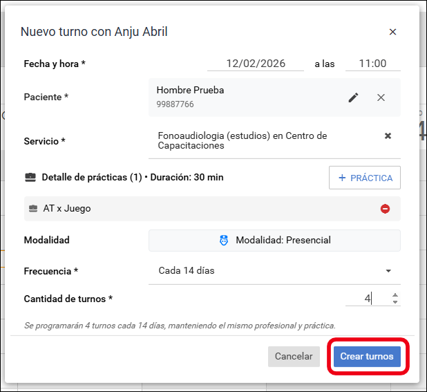 - Hacé click en crear turnos una vez que esté todo completo