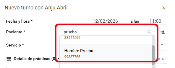 - Buscá por nombre, apellido o DNI, y seleccioná el paciente